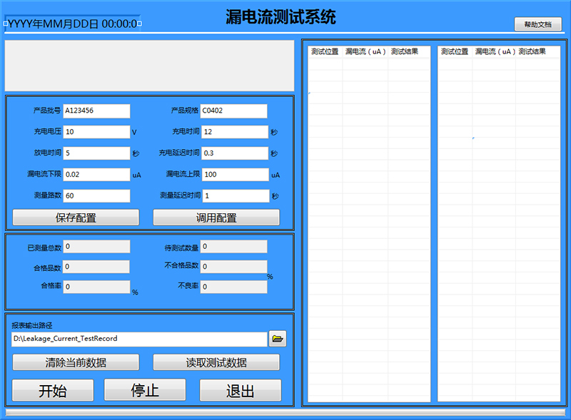 3)軟件主要功能:實(shí)現(xiàn)開關(guān)自動切換,自動對電容進(jìn)行充放電,以及漏電流測試,自動將產(chǎn)品批號,產(chǎn)品規(guī)格以及測試數(shù)據(jù)寫入測試報表中(excel或txt文本文件),實(shí)現(xiàn)測試記錄可追溯,測試參數(shù)設(shè)置保存,調(diào)用,結(jié)果自動對比PASS/Fail。如需更多功能可定制。