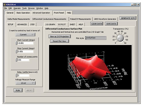 Keithley''s approach to differential conductance, a four-wire, source current/measure voltage technique, uses the 6220 and 6221 Current Sources and 2182A Nanovoltmeter. The current sources combine the DC and AC components into one source, with no need to do a secondary measure of the current, because its output is much less dependent on the changing device impedance |