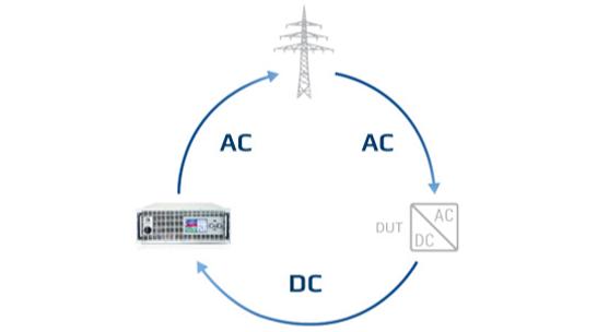 可再生電子負(fù)載和雙向電源可回收高達(dá)其所吸收能量的96%,這意味著交流電源連接也被用作所提供直流能量的反向輸入輸出。