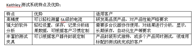 總體介紹: Keithley測(cè)試系統(tǒng)全部采用Keithley測(cè)試儀器搭建而成,保證其具有高精度,高穩(wěn)定性,高性價(jià)比等特點(diǎn),配合強(qiáng)大的軟件分析功能,可以實(shí)現(xiàn)數(shù)據(jù)自動(dòng)保存,記錄,分析,圖形顯示等功能,具有友好的操作界面,豐富的測(cè)試夾具應(yīng)對(duì)各種不同封裝器件的挑戰(zhàn),再也不用為連接問(wèn)題煩惱,讓測(cè)試變得更簡(jiǎn)單,高效,智能。