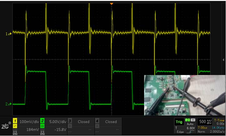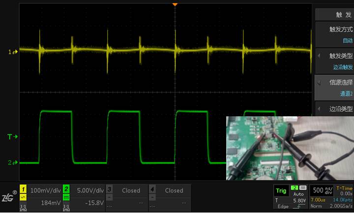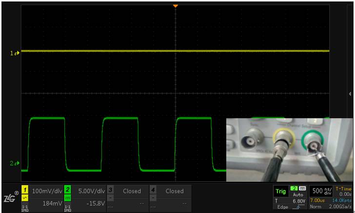 1、通道1探頭使用鱷魚夾接地,通道2關(guān)閉(證明通道1信號原狀,見圖2);
