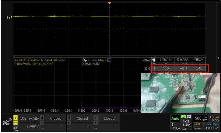 注:上圖通道1信號幅度雖然非常小,但通過FFT分析還是可以定位出600K頻點的干擾。