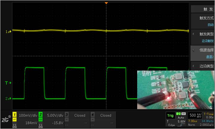 測試方法:通道1測量小信號(100mv/div),通道2測量大信號(5V/div),觀察信號互相影響的情況。