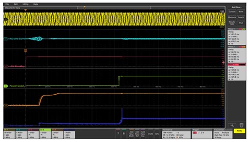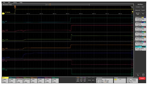 +5 V待機電壓信號為相關(guān)信號采集提供一個簡單的上升沿觸發(fā)。自動測量功能檢驗輸出電壓啟動延遲是否為< 100 ms,從輸出電壓啟動到PW OK的延遲位于100 – 500 ms的規(guī)范范圍內(nèi)。