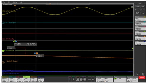 下面截圖中被測的開關(guān)電源生成了一個高電流、穩(wěn)壓的12 VDC輸出。這個電源通過儀器前面板上的開關(guān)進行遠程遙控。在開關(guān)按下后不久,+5 V待機電源打開,開關(guān)轉(zhuǎn)換器啟動。在+12 V輸出穩(wěn)定后,Power Good (PW OK)信號變?yōu)楦唠娖,向負載表明供電可靠。