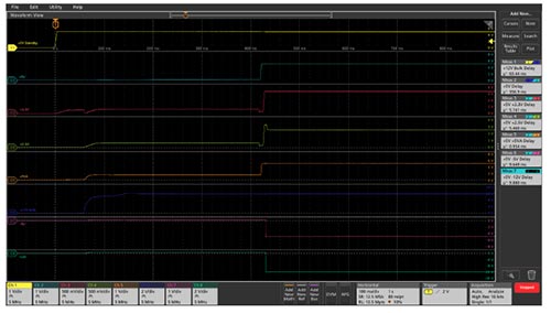 與前面所有方法相比,使用具有8條模擬通道的示波器可以明顯縮短時間,減少混亂。在8通道示波器中,可以使用模擬探頭表征擁有8條電源排線。為測量擁有8條以上電源排線開機和關(guān)機定時關(guān)系,也可以使用擁有數(shù)字信號輸入及獨立可調(diào)閾值的混合信號示波器。