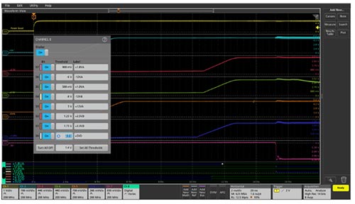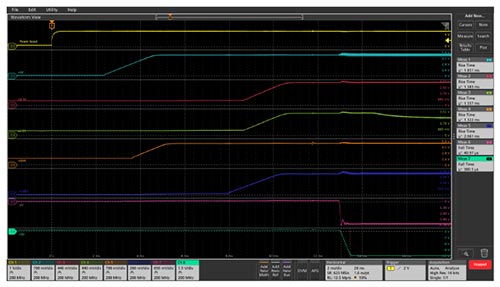 一旦把各種芯片供電要求、整體供電、基準供電及其他IC多個負載點穩(wěn)壓器組合在一起,您會很快遇到七八根電源線。 使用4通道示波器檢驗嵌入式系統(tǒng)中的電源線定時可能會非常耗時,但這是大多數(shù)工程師必須要做的事。在我們與示波器用戶溝通時,評估開機順序和關(guān)機順序是工程師想要4條以上通道的常見的原因之一。在本文中,我們將簡要介紹使用4通道示波器評估開機順序和關(guān)機順序,并演示使用8通道示波器的部分實例。