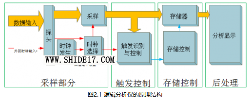 邏輯分析儀的組成結(jié)構(gòu)如圖2.1所示,它主要包括數(shù)據(jù)捕獲和數(shù)據(jù)顯示兩大部分。邏輯分析儀一般采用先進(jìn)行數(shù)據(jù)采集并存儲(chǔ),然后進(jìn)行數(shù)據(jù)分析顯示方式。