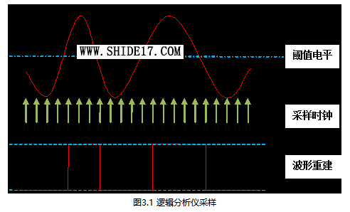 由于邏輯分析儀不像示波器具有許多電平等級(jí),通常只顯示兩個(gè)值(邏輯“1”和“0”)。如圖3.1所示設(shè)定了門(mén)限電壓后,邏輯分析儀將被測(cè)信號(hào)通過(guò)超高速比較器與門(mén)限電壓進(jìn)行比較,高于門(mén)限電壓為邏輯“1”,低于則為邏輯“0”。例如:一個(gè)待測(cè)信號(hào)使用500MHz采樣率的邏輯分析儀,當(dāng)參考電壓設(shè)定為1.7V時(shí),在測(cè)量時(shí)邏輯分析儀就會(huì)平均每隔2ns(500MHz)采樣一個(gè)點(diǎn),超過(guò)1.7V為“1”,低于則為“0”,把所有采樣得到的“1”和“0”按照時(shí)間關(guān)系連接成一個(gè)波形,用戶便可在此連續(xù)波形中找出異常之處。
