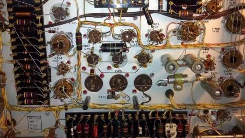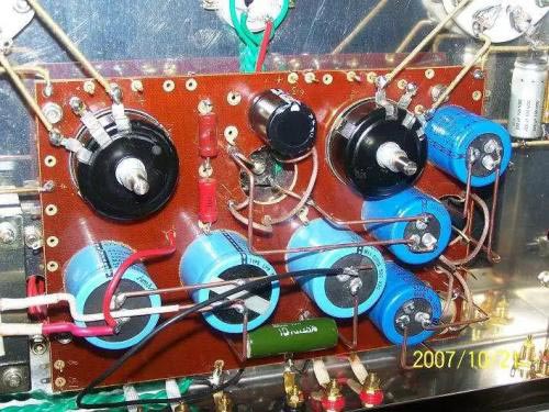 順便說一說這個時代的制造工藝,因為電子管本身體積較大,而且多半隨著高壓大電流,所用的器件體積也很大,無論國內(nèi)還是國外都是這樣安裝元器件的,也就是元件安裝在支架上,然后用線相互連接。這種方式國內(nèi)俗稱搭棚焊接。