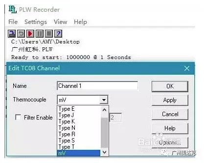 5、編輯USB TC-08插入接線端子板對應的一個通道,將“Thermocouple”設置成“mV”。