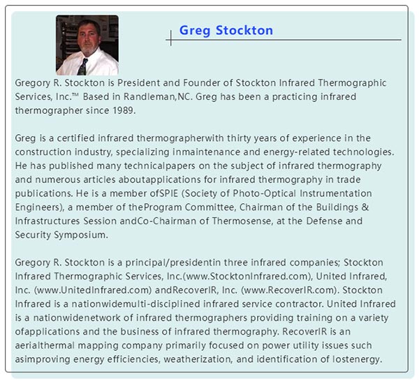 Greg Stockton是斯托克頓紅外檢測服務(wù)公司的董事長和創(chuàng)始人,公司位于北卡羅來納州蘭德爾曼。Greg自1989年以來,一直從事于紅外檢測。