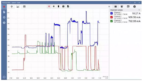 最后Trevor還用上了一臺(tái)PicoLog CM3電流數(shù)據(jù)記錄儀,用上面配的三根電流鉗套在三相電上,運(yùn)行PicoLog的軟件記錄長(zhǎng)時(shí)間工作的電流波形。