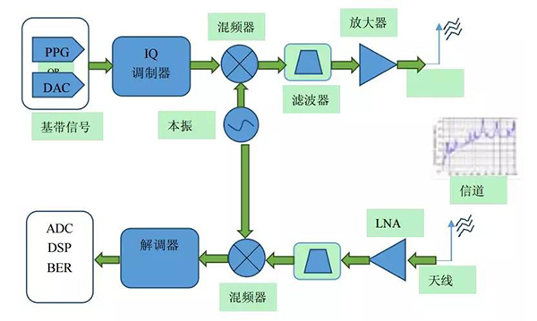 在 THz 的通信中,從器件,包括輻射源、波導(dǎo)、濾波器、調(diào)制器,甚至天線到系統(tǒng)都有廣闊的研究空間,除了基礎(chǔ)的器件驗(yàn)證,對其通信系統(tǒng)的指標(biāo)也都往往需要進(jìn)行評估。系統(tǒng)大致框圖如下: