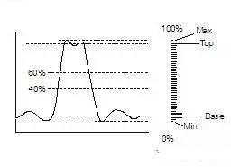 示波器的工作過程是:先對(duì)整個(gè)屏幕進(jìn)行幅度統(tǒng)計(jì)分析,可以得出最大電壓的位置和最小電壓的位置,然后對(duì)最大最小幅度的上面40%部分進(jìn)行統(tǒng)計(jì)分析,得到的平均值,此為Vtop值;對(duì)最大最小幅度的下面40%部分進(jìn)行統(tǒng)計(jì)分析,得到的平均值,此為Vbase值。不用統(tǒng)計(jì)分析中間的20%部分,防止被測波形是3態(tài)信號(hào),而得出錯(cuò)誤的結(jié)論。如圖1所示。