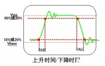 一旦測試出Vtop和Vbase,基于我們設(shè)置的測量門限(示波器的測量門限默認(rèn)是10%,50%,90%),示波器可以對(duì)電壓和時(shí)間參數(shù)進(jìn)行自動(dòng)測量。