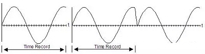 由于示波器選擇有限的點(diǎn)數(shù)進(jìn)行FFT運(yùn)算,而FFT在原理上是盡可能采用有限長度時(shí)間記錄來近似傅式變換對(duì)整個(gè)時(shí)間的積分。在隨時(shí)間不斷重復(fù)波形時(shí),某些波形的形狀和相位可能會(huì)引入瞬變現(xiàn)象,如圖8所示。
