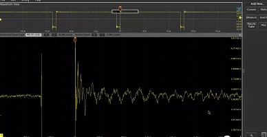 圖2顯示的是用不同垂直分辨率的示波器測試同一個開關(guān)電路開關(guān)導通瞬間震蕩波形的對比。為測試完整的波形,需要對示波器設(shè)定選擇一個較大的量程;同時工程師需要對邊沿的震蕩放大以對細節(jié)進行觀測。圖3和圖4是這兩臺示波器在同樣設(shè)置條件下(250MSa/s采樣率,10k樣點,2V每格)實際測試結(jié)果?梢奙DO4000C示波器(8位)測試結(jié)果,因為其垂直分辨率的限制,放大后出現(xiàn)明顯的量化臺階,基本無法進行分析;而泰克全新4系列MSO示波器(12位)捕獲的波形,放大后仍能準確復現(xiàn)震蕩信號的細節(jié)。