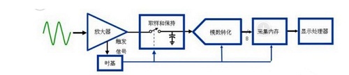 波形首先要通過探頭,經(jīng)由前端的放大器進(jìn)行放大,之后由模數(shù)轉(zhuǎn)換單元進(jìn)行轉(zhuǎn)換,進(jìn)而存儲到采集內(nèi)存中,然后顯示到顯示器上。