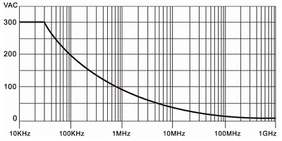 最大輸入電壓是指探頭可以輸入的最大額定值的電壓。最大輸入電壓取決于探頭機身和探頭內(nèi)部器件的額定擊穿電壓。一般該項會通過一些安規(guī)規(guī)范來給出,而不是給出單一的電壓,比如一般10×的無源探頭的最大輸入電壓為300VRMS CAT Ⅱ。其中CAT Ⅱ 指的是一類測試場景,300VRMS CAT Ⅱ指的是在這類測試場景下可以測量的最大電壓。而且這個電壓并不是一個恒定值。而是會隨著頻率的變化而變化。一般探頭會給出自己的電壓額定曲線,如下圖所示: