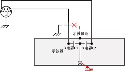 使用探頭進行測量時,最重要的就是安全問題。比如使用無源探頭時,探頭的地線與示波器的地是連接在一起的,當(dāng)示波器安全接地的時候,探頭是安全的。但是當(dāng)示波器沒有安全接地時,探頭的地線就會存在一定的電壓從而給使用者帶來危險。具體情況如圖5所示: