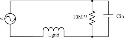 由于地夾線比較長,其會形成一個寄生電感Lgnd,隨著夾線的增長,這個電感也會增大,而這個回路電感會和示波器探頭的輸入電容Cin產(chǎn)生諧振。這就導(dǎo)致示波器的幅頻特性變得不平坦,導(dǎo)致測量不準確。下圖為使用接地夾時的等效電路。