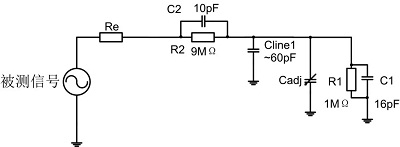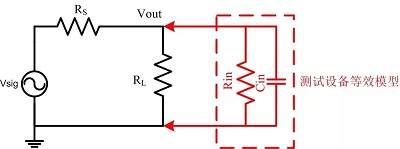 前文提到過,探頭都是具有輸入電容和輸入電阻的,這就導(dǎo)致其并不能當(dāng)成一個阻抗無窮大的設(shè)備,其測量時的等效模型如下圖所示。