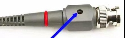 文章開始圖中,最黑的那個棒棒就是調(diào)節(jié)棒,在最前面有一個扁平的不銹鋼,形似改錐,這個調(diào)節(jié)棒就是一個改錐,用來調(diào)節(jié)探頭的補(bǔ)償電容,把你的探頭拿出來,找到螺絲孔,如下圖: