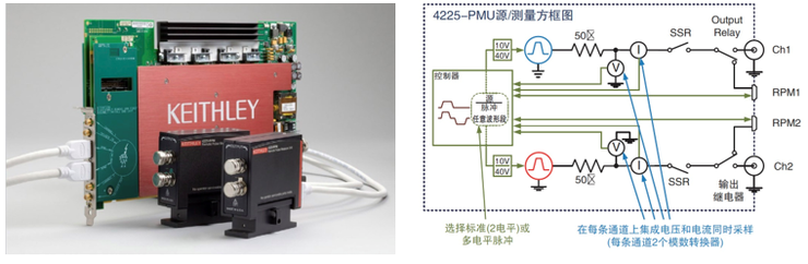 上圖:4225-PMU 超快速I-V 模塊和兩個(gè)4225-RPM 遠(yuǎn)程放大器/ 開關(guān)模塊。右圖:4225-PMU 方框圖,通過(guò)使用RPM1 和RPM2 連接,可以使用4225-PMU 及兩個(gè)4225-RPM。SSR 顯示了固態(tài)中繼器,其用于高阻抗模式,通過(guò)Fowler-Nordheim 隧道在閃存器件上執(zhí)行編程或擦除操作。