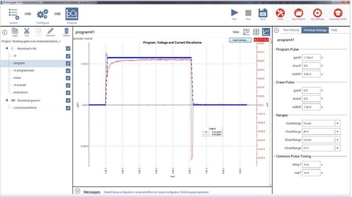 Clarius 軟件帶有一套NVM 表征使用的范例項(xiàng)目?梢允褂肕emory 過(guò)濾器在Project Library 項(xiàng)目庫(kù)中找到范例項(xiàng)目。這些項(xiàng)目為閃存、PRAM、FeRAM 和ReRAM 器件提供了測(cè)試和數(shù)據(jù),演示了4200A-SCS 特別是4225-PMU 及4225-RPM 的功能。上圖是閃存器件項(xiàng)目浮柵非易失性內(nèi)存表征項(xiàng)目的截圖。4225-PMU/4225-RPM 相結(jié)合,提供了基礎(chǔ)脈沖和瞬態(tài)I-V 測(cè)試功能,可以考察和表征各種NVM材料和器件