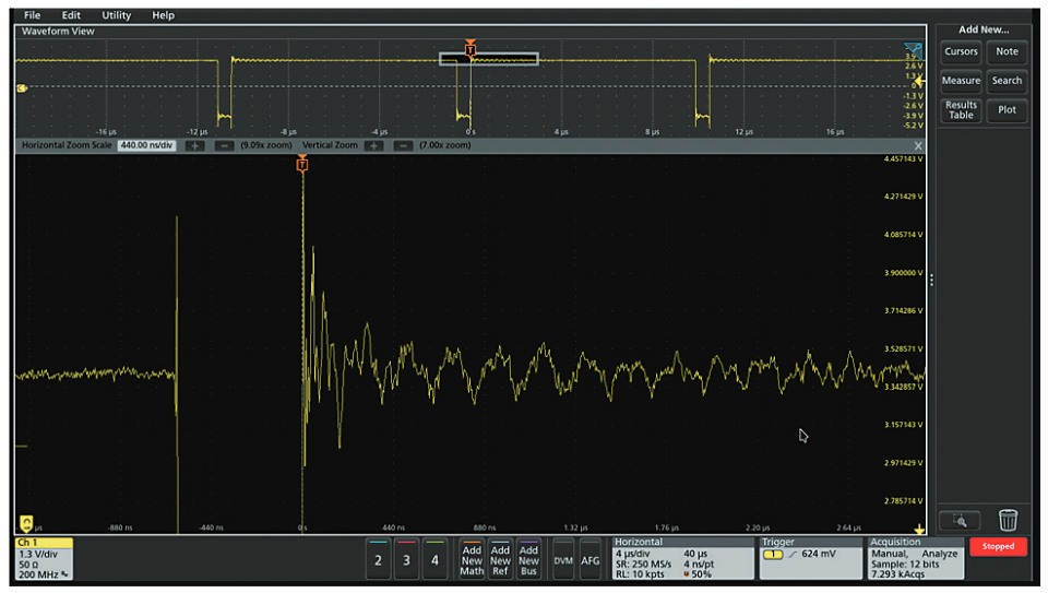 然而,12位示波器在相似的放大倍數(shù)下依然可以清晰地顯示振蕩細(xì)節(jié)。