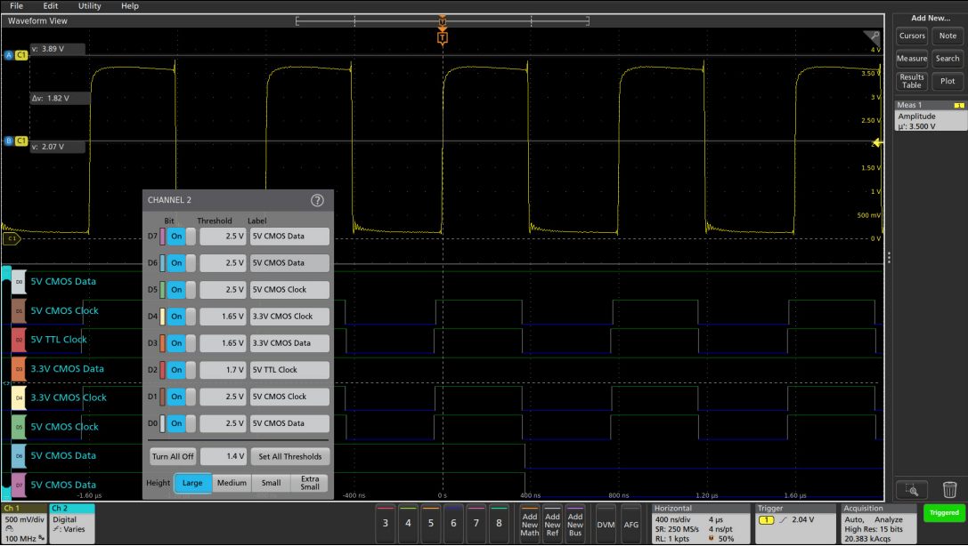 對(duì)于3系列MDO、MSO2000和MDO3000系列,閾值是按探頭組(一個(gè)8通道的組)調(diào)整的,因此TTL信號(hào)將在一個(gè)探頭組上,而LVPECL信號(hào)將在第二個(gè)探頭組上。