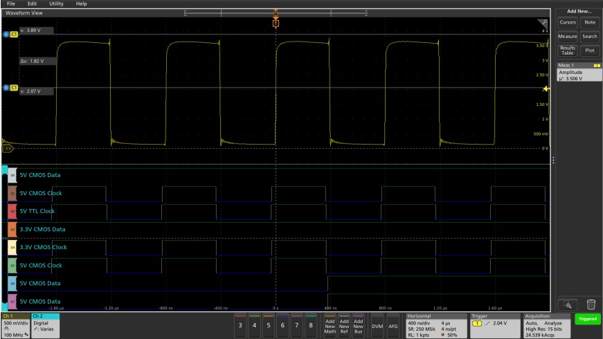 MSO的模擬通道可以快速檢查數(shù)字信號(hào)的邏輯擺幅。在圖1中,示波器自動(dòng)測(cè)量數(shù)字信號(hào)的幅度約為3.6V。對(duì)于具有對(duì)稱電壓擺幅的邏輯系列,如CMOS,閾值為信號(hào)幅度的一半。然而,對(duì)于具有非對(duì)稱電壓擺幅的邏輯系列,如TTL(晶體管-晶體管邏輯),通常需要參考組件數(shù)據(jù)表并將閾值定義為邏輯器件的最大低電平輸入電壓(TTLVIL=0.8V)和最小高電平輸入電壓(TTLVIH=2.0V)之間的中點(diǎn)(TTLV閾值=1.4V)。