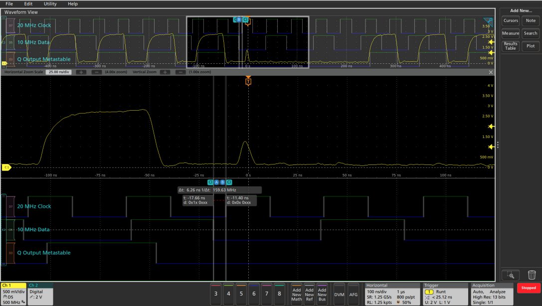 使用這些觸發(fā)設(shè)置中的任何一個,您都可以捕獲輸入和輸出信號。圖3顯示了使用光標(biāo)進行的建立時間測量,清晰地指示了建立時間違規(guī)(大約6ns,遠低于20ns的最小值)。泰克混合信號示波器結(jié)合了基本的邏輯分析儀功能和示波器的模擬信號分析功能。