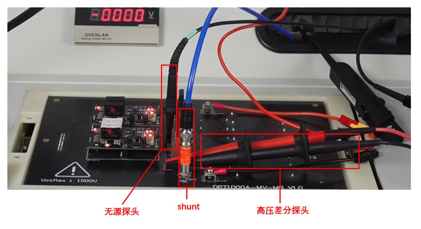 端電壓測(cè)量選用高壓差分探頭,在滿足寬電壓測(cè)量范圍的同時(shí)具有更大的輸入阻抗,提供了安全的測(cè)試保障。端電流測(cè)試選用shunt電阻,其帶寬達(dá)到1GHz以上,能夠滿足高速器件對(duì)帶寬的要求。