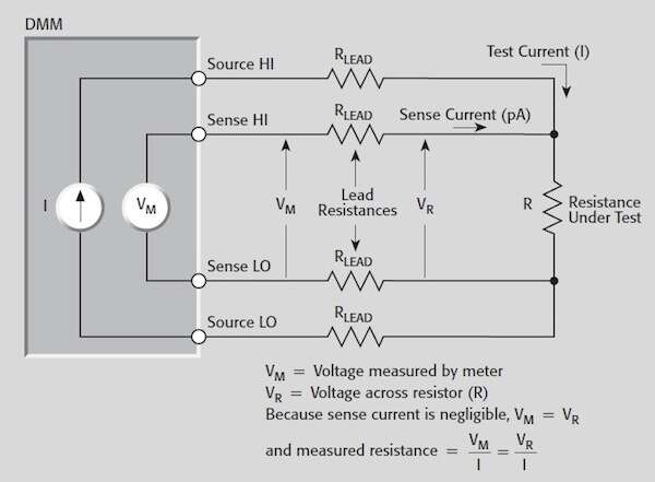 使用這種配置,測試電流 (I) 通過一組測試引線強制通過測試電阻 (R),而 DUT 上的電壓 (VM) 通過第二組引線(感應(yīng)引線)測量。