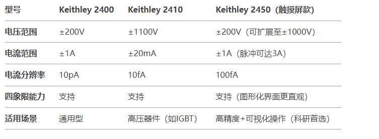 常規(guī)半導(dǎo)體測試:2400系列性價(jià)比高,覆蓋多數(shù)中壓/中流需求。