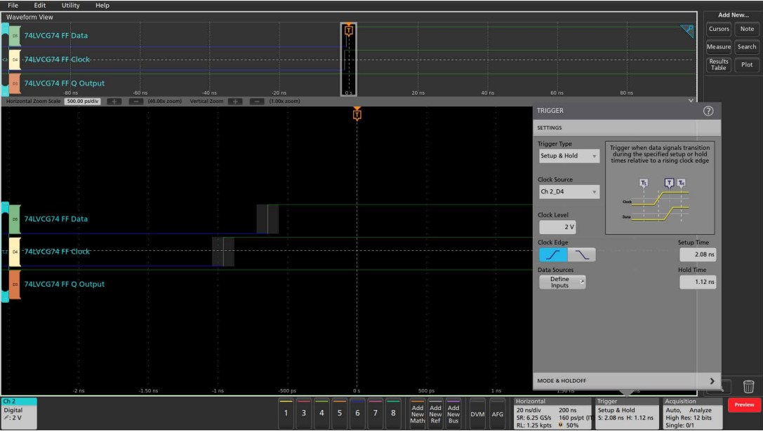 在查閱74LVCG74組件數(shù)據(jù)表后,將建立和保持時間觸發(fā)參數(shù)分別設(shè)置為2納秒和1納秒,以捕獲任何違規(guī)情況,如圖1所示。MSO會自動觸發(fā)在第一個違反指定參數(shù)的輸入條件上。