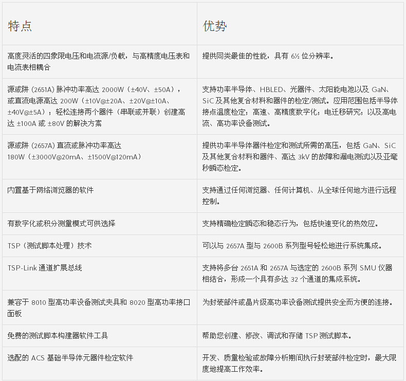 - 功率半導體和元器件檢定解決方案 2650 系列大功率 SourceMeter SMU 儀器專為高電壓/電流電子產(chǎn)品和功率半導體元件(例如,二極管、FET 和 IGBT、高亮度 LED、直流至直流轉(zhuǎn)換器、電池、太陽能電池及其他高功率材料、組件、模塊和部件)的檢定和測試而設(shè)計。 它們提供前所未有的功率、精度、速度、靈活性,且容易用于提高研發(fā)、生產(chǎn)測試和可靠性環(huán)境中的效率。 有兩種儀器可用,提供高達 3000V 或高達 2000W 的脈沖電流功率。