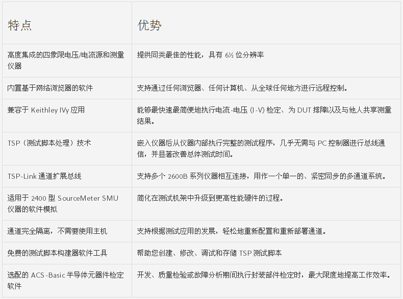 - 單通道和雙通道可擴展源和測量 2600B 系列 SourceMeter SMU 儀器單通道和雙通道型號提供業(yè)界最寬的動態(tài)范圍:10A 脈沖至 0.1fA 以及 200V 至 100nV。 Keithley 的 IVy 應(yīng)用提供現(xiàn)代化的界面,利用強大和快速的高分辨率 SMU 儀器來執(zhí)行快速 I-V 檢定。 2600B SMU 儀器極大地提升了從臺式 I-V 檢定到高度自動化生產(chǎn)測試的各種應(yīng)用中的效率。 ?