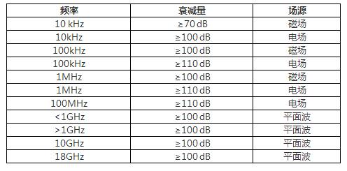 測試頻率范圍為9kHz-18GHz,滿足EN 50147和GB/T 12190的要求,所有設(shè)施及配套部件都不會影響屏蔽性能。屏蔽性能滿足以下要求: