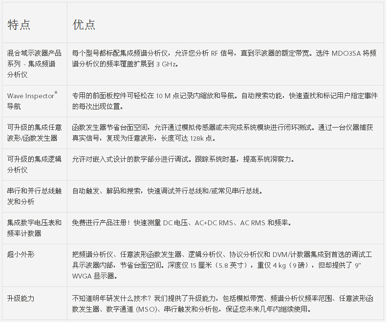 - 六種儀器,一臺示波器,無限多功能。 MDO3000 混合域示波器擁有六種儀器,包括頻譜分析儀、函數(shù)發(fā)生器、等等,讓您通過一臺示波器就能捕獲模擬信號、數(shù)字信號和 RF 信號。隨著設計挑戰(zhàn)不斷變化,您甚至可以添加儀器、分析功能并升級帶寬。