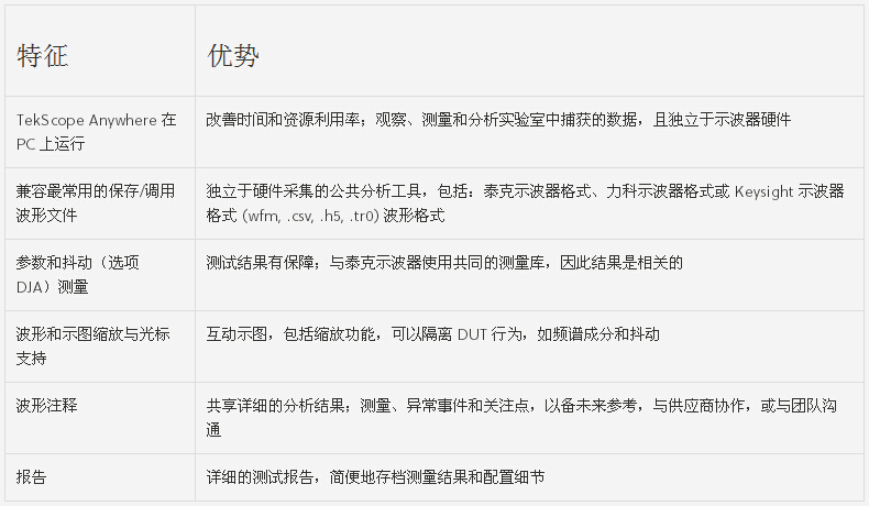 - TekScope AnywhereTM 波形分析把示波器分析環(huán)境的處理能力帶到基于 Windows 的 PC、服務器和平板中。用戶現在可以靈活地執(zhí)行各項分析任務,包括在實驗室外部進行定時、眼圖和抖動分析。 可以在團隊成員和遠程站點之間迅速共享泰克 DPO/MSO5000、DPO7000C 和 DPO/MSO70000C/D/DX 系列示波器的波形數據和設置,從而改善工作效率。